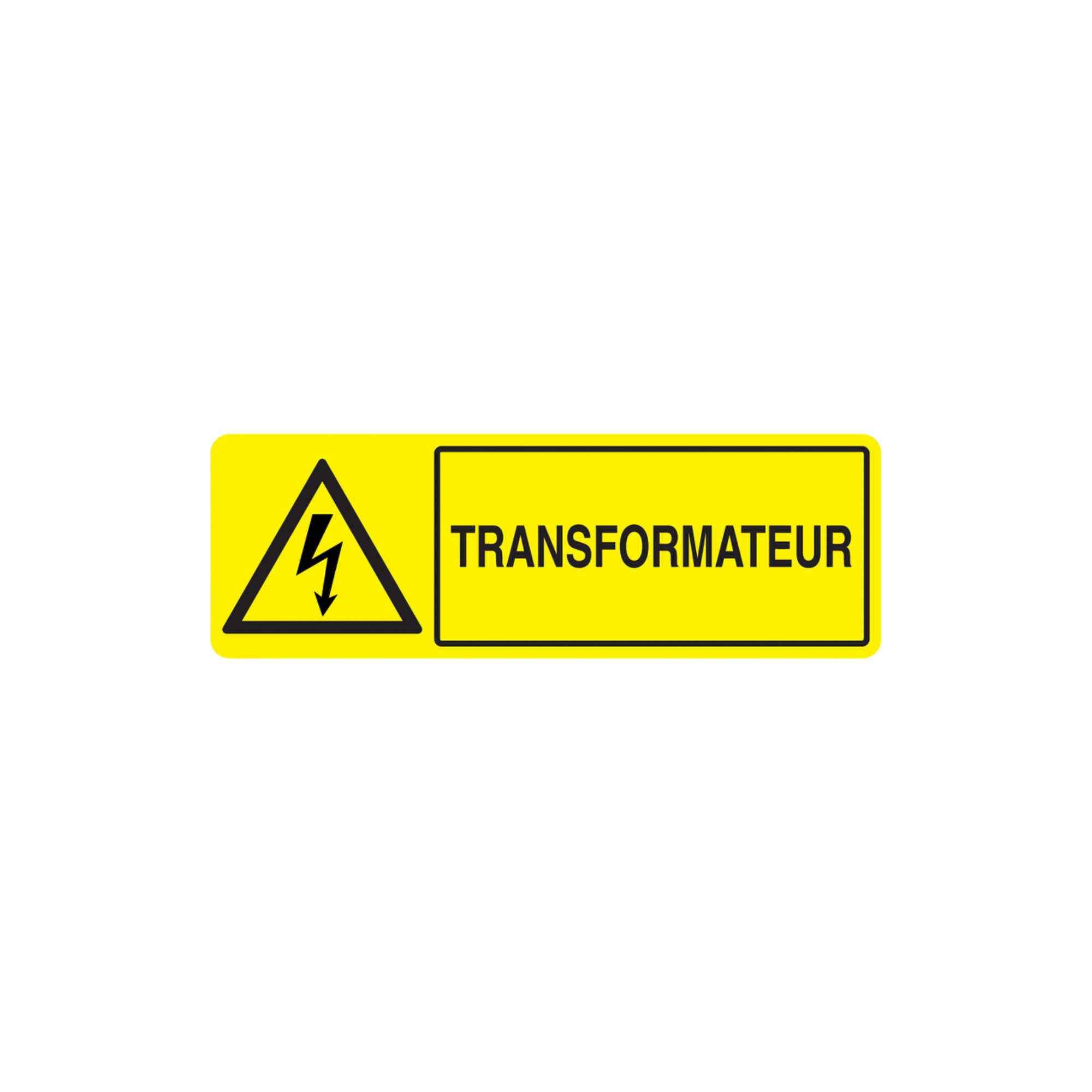 L’association d’un pictogramme de danger électrique avec l’inscription Transformateur permet une compréhension immédiate de l’équipement présent, même en situation d’intervention rapide ou d’urgence.